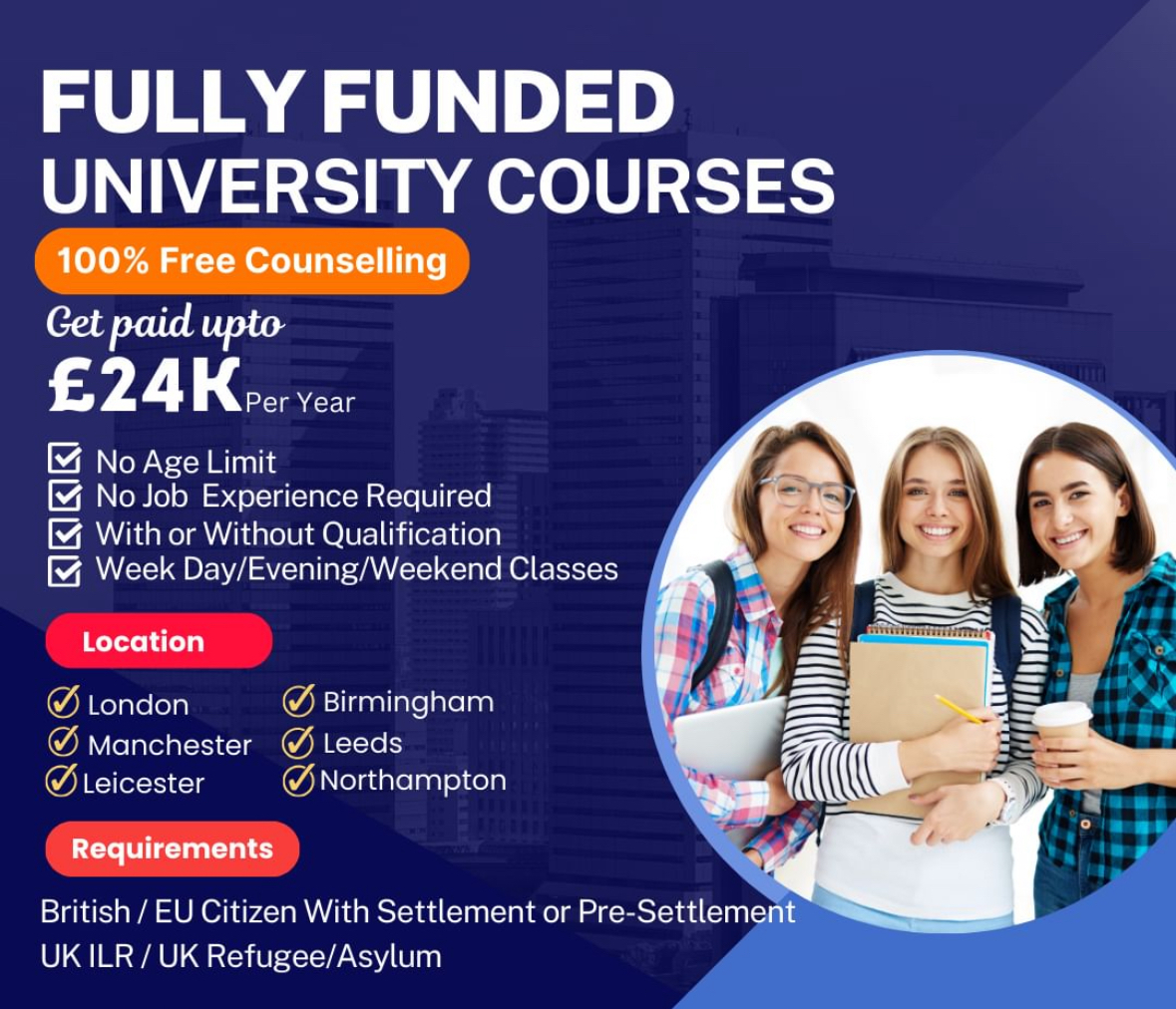 UK nationals and EU students are eligible for government-funded higher education in the UK, with potential funding of up to £18000 per year for 4 years in any course, including separate tuition fees, extra grants for dependants and adult learning allowance depending on individual family circumstances.